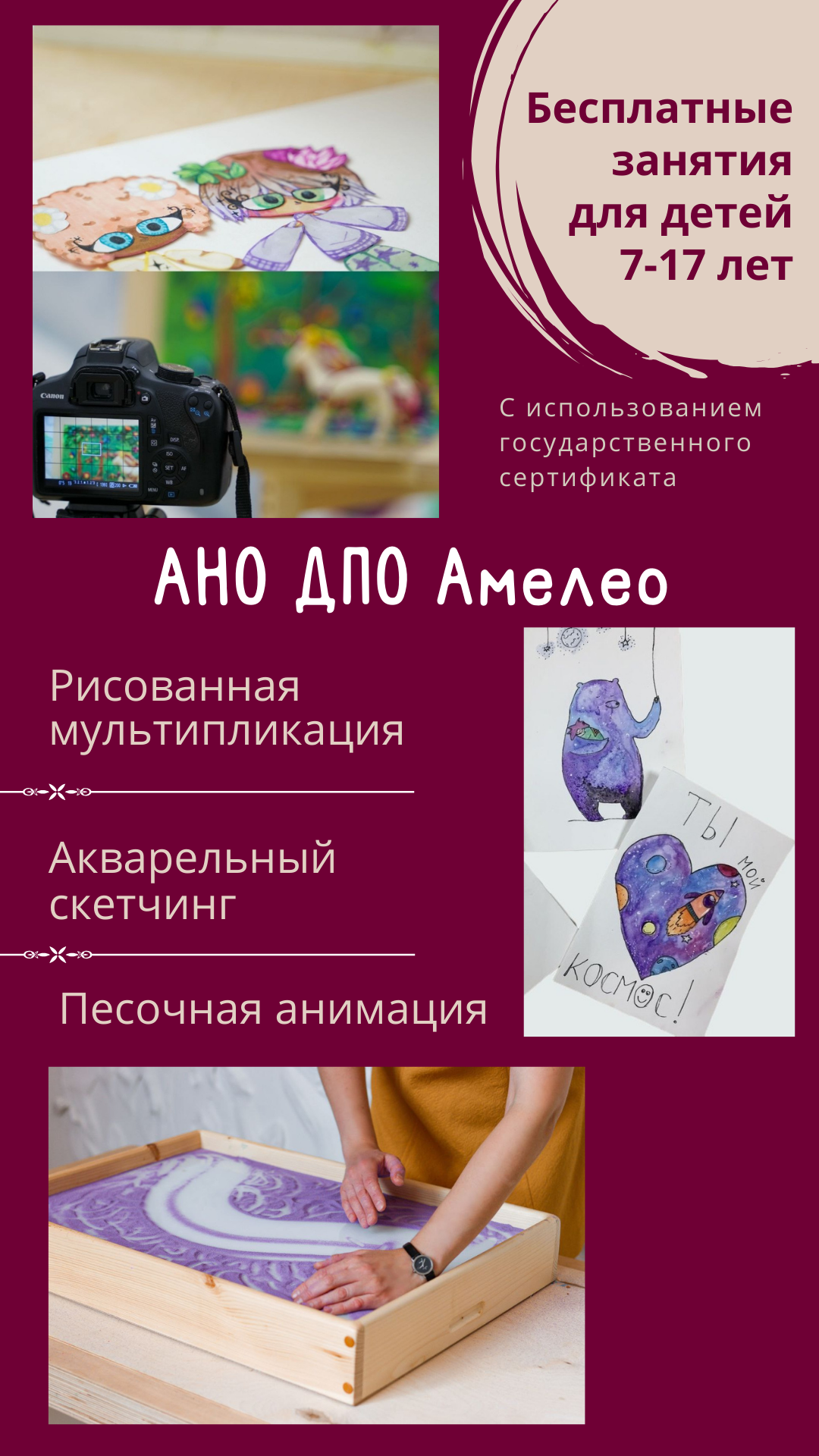 Во время творческих интенсивов по мультипликации дети сами придумывали сюжет, выбирали главных героев и место, где происходят события. Затем готовили раскадровку, рисовали либо лепили персонажей, создавали декорации и фоны, делали покадровую сьёмку, самостоятельно озвучивали мультфильмы и принимали участие в монтаже с профессиональным мультипликатором.
