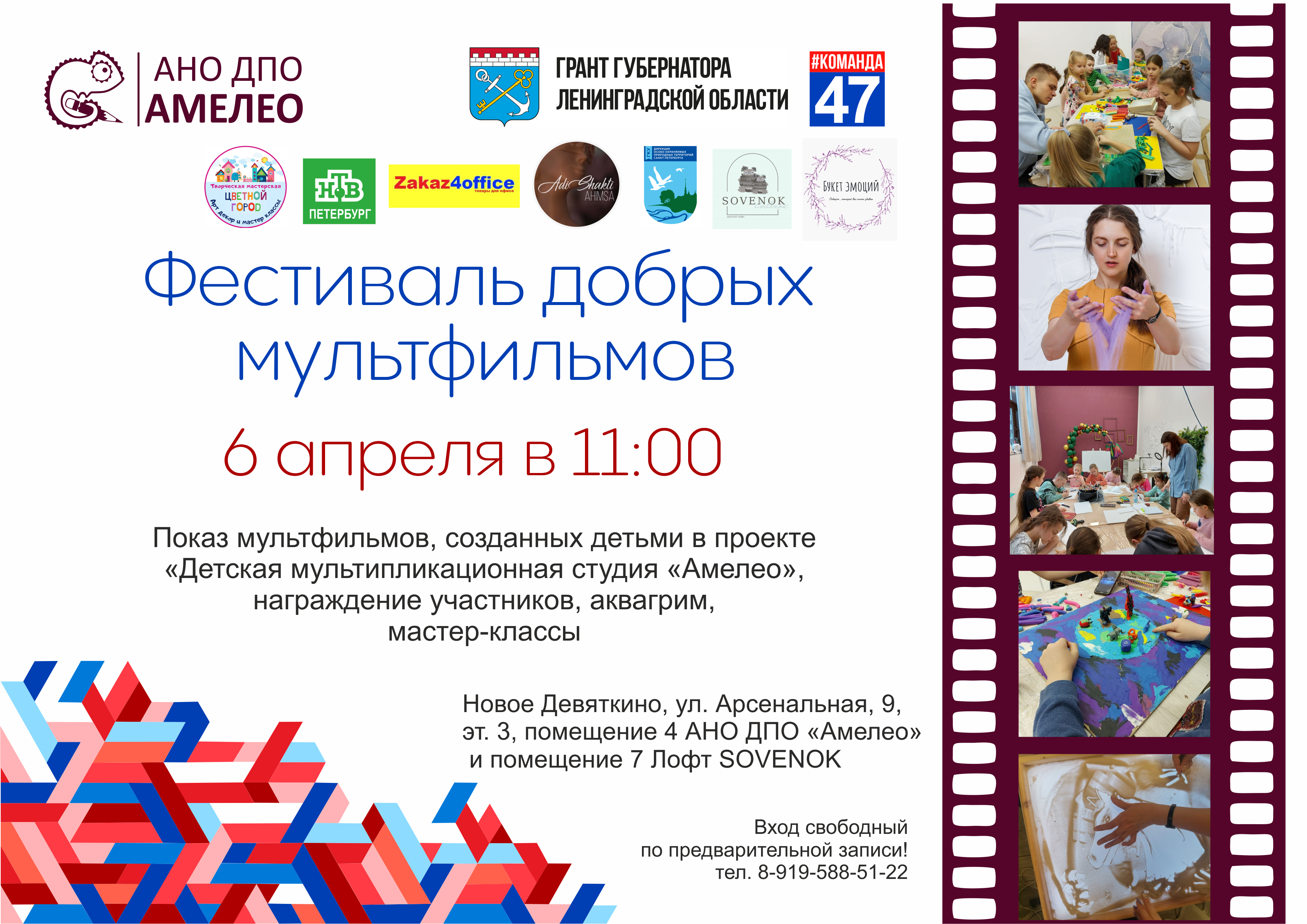 В завершении проекта состоится «Фестиваль добрых мультфильмов» с показами детских работ на большом экране, обсуждением их с авторами, красной дорожкой, аквагримом, бесплатными мастер-классами и интерактивами.